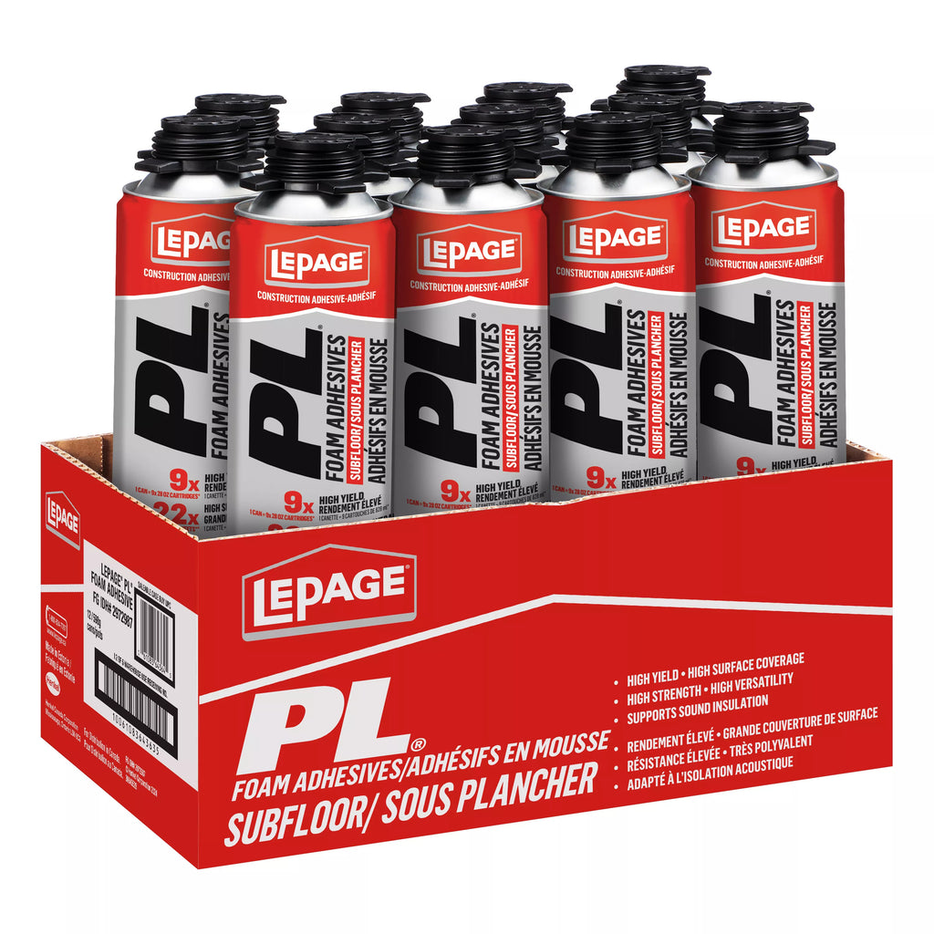 LePage 2972987 PL Subfloor Foam Construction Adhesive 598g/ 21.1oz. is a high-strength polyurethane-based product, primarily designed for subfloor installation to reduce floor squeaks effectively. It applies as a collapsible gel foam that slowly expands to fill gaps, allowing faster application than traditional adhesives while delivering superior bonding performance—this makes it ideal for wood-to-wood assemblies and glued floor systems. The adhesive works on dry, frozen, or damp surfaces; beyond bonding subfloor boards to joists, it can also be used for indoor and outdoor bonding of common building materials such as OSB, plywood, concrete, and masonry.