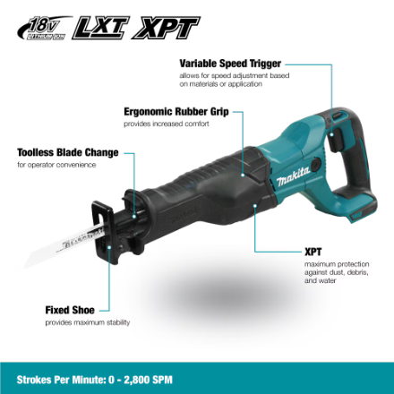The Makita Reciprocating Saw delivers efficient, spark-free cutting for metal, wood, and demolition applications. Featuring a 32 mm stroke length and a variable stroke rate up to 2,800 SPM, it provides smooth, precise control with a responsive trigger. Its quick-release blade system allows fast, tool-free blade changes for maximum productivity on the job site.