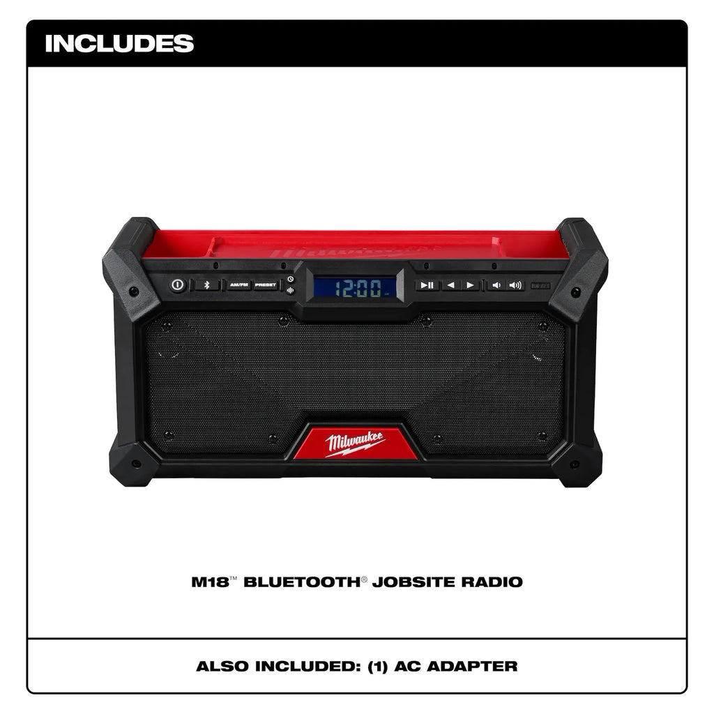Our M18™ Bluetooth® Jobsite Radio features dual 3.5” woofers and 2 high range tweeters to provide a BALANCED SOUND experience. Bluetooth® 5.0 provides up to 120 ft of range to keep you connected. Equipped with AM/FM capabilities and 18 presets, tune in wherever the job takes you. Built-in equalizer settings allow you to customize the bass and treble to your preferred sound. BUILT FOR THE JOBSITE our radio provides up to 13 hours of runtime at MAX volume on an M18™ XC5.0 battery. The durable design & metal grille withstands demanding jobsite environments and delivers water, dust, and impact resistance. Charge up personal devices with USB-C 3.0A device charging. Power the radio with any M18™ battery or the provided AC Adapter for complete versatility. The M18™ Bluetooth® Jobsite Radio delivers BALANCED SOUND that is BUILT FOR THE JOBSITE.
