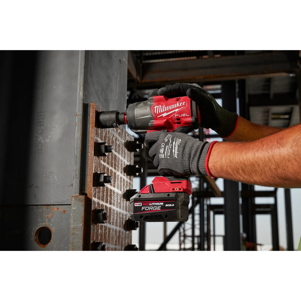 Our M18 FUEL™ ½” High Torque Impact Wrench w/ Friction Ring is the most power-dense impact wrench in its class, provides greater access in tight spaces, and maximizes productivity through faster removal speeds. The POWERSTATE™ Brushless Motor delivers up to 1,200 ft-lbs of Fastening Torque and 1,600 ft-lbs of Nut-Busting Torque when paired with our M18™ REDLITHIUM™ FORGE™ Batteries, while the compact size at 7.6" in length gives users greater access in tight spaces. The M18 FUEL™ ½” High Torque Impact Wrench w/ Friction Ring maximizes productivity on the jobsite and in the shop by removing stubborn bolts and fasteners faster than cordless competitors. Our patented battery isolation system provides a secure battery connection and controls vibration transmitted to the pack. Tri-LEDs surround the anvil to deliver brighter light with fewer shadows. 4-Mode DRIVE CONTROL™ offers greater precision with a range of pre-set RPM and IPM levels, selectable from a single button on the tool. By selecting Mode 4, AUTO SHUT-OFF™ control applies no more than 50 ft-lbs of torque for hand-tight fastening applications to prevent overtightening. Mode 4 also features Bolt Removal Control that delivers our users full torque output, then decreases RPMs once the bolt is loosened to prevent fastener drops. The included M18™ REDLITHIUM™ FORGE™ XC 8.0 Battery Pack delivers HIGH OUTPUT™ HD12.0 power in a smaller size, 35 minute supercharge to 80%, and longest life vs. REDLITHIUM™ batteries.