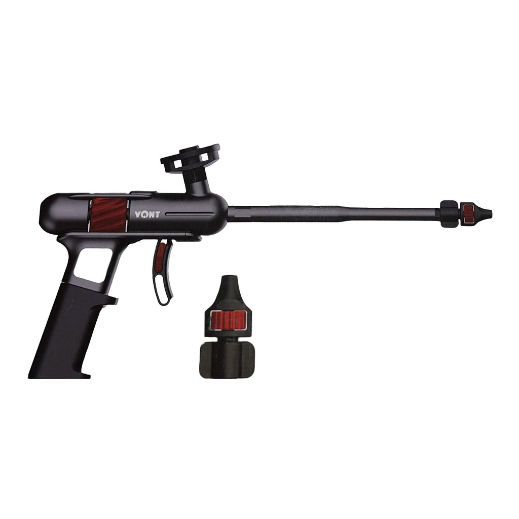 The Vont Dual Purpose Spray Foam Gun With Adjustable Nozzle is built for foam spraying, suitable for situations requiring object restoration. Its cylindrical shape features a split design, a burgundy roller, and a time capsule form.