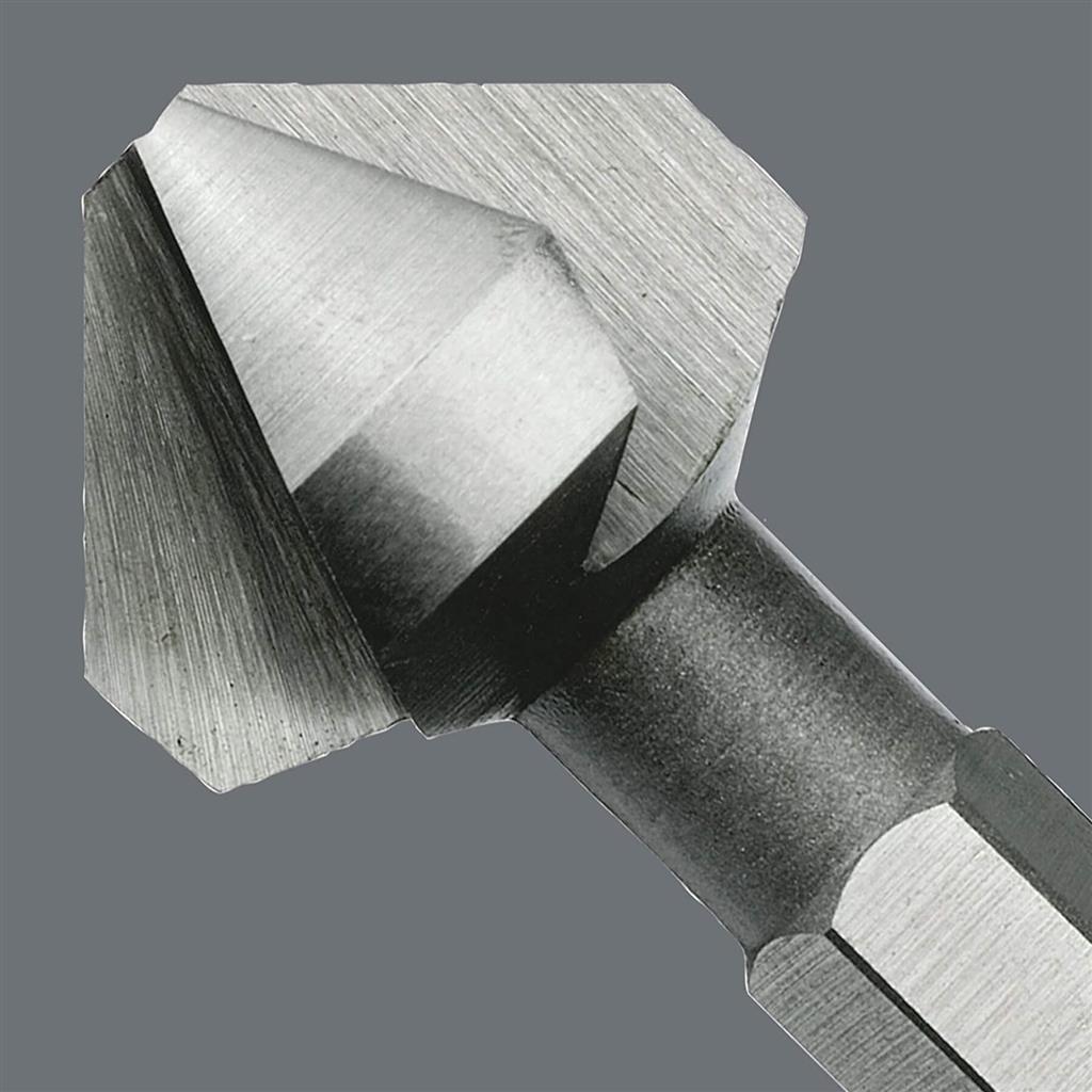 Wera 05104650001 846/8 1/4 in. Bitholding Quick-Release Chuck Screwdriver and 3-Flute Countersink Bits Set (8-Piece) comes in a stable plastic box for deburring, chamfering and countersinking. The finely-tuned material elasticity provides for great durability. Perfect chip removal and a low tilt risk ensure pleasant working. Cutting section as per DIN 335-C, 90ΓΒ° with 3 cutters. High quality, ergonomic bit holder equipped with a magnet. The Rapidaptor quick-release chuck ensures rapid bit change without any extra tools. 1/4" hexagon, suitable for holders with take-up as per DIN ISO 1173-D 6.3.